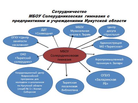 МБОУ Солерудниковская гимназия взаимодействует с предприятиями, расположенными на территории МО «Заларинский район» ОГКУ «Центр занятости населения» Заларинского района, ОАО «Тыретский солерудник», ОАО «Иркутская электросетевая кампания» (УПК-500). Целью взаимодействия является профориентация и профессиональное самоопределение воспитанников гимназии.