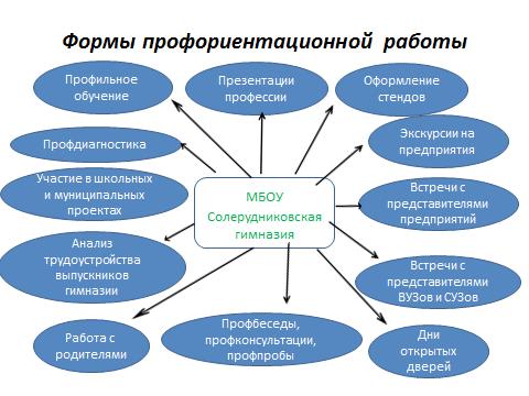 В МБОУ Солерудниковская гимназия профориентация реализуется в разных формах: через деятельность Клуба «Диалог», профильную школу «Авангард», организацию экскурсий. На протяжении нескольких лет организовывалась работа профильной школы «Авангард».